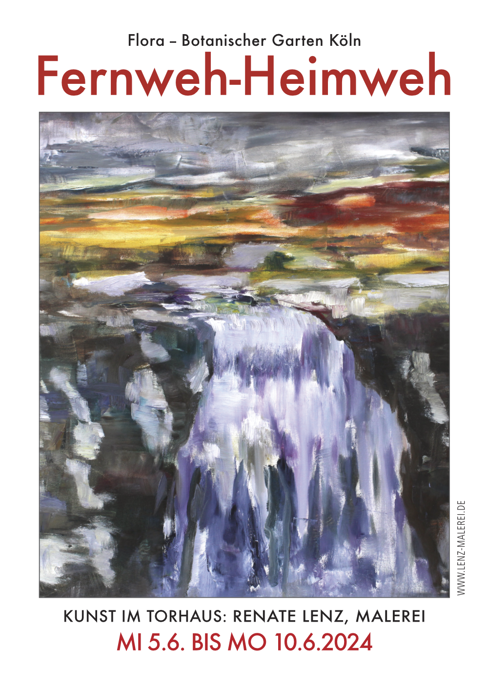 5.6. bis 10.6.2024: Kunst im Torhaus. Flora – Botanischer Garten Köln Thema: „Fernweh – Heimweh“ Wonach sehnen wir uns, worin fühlen wir uns zu Hause? Ein malerischer Such- und Findungsprozess in Landschaftsvorstellungen.